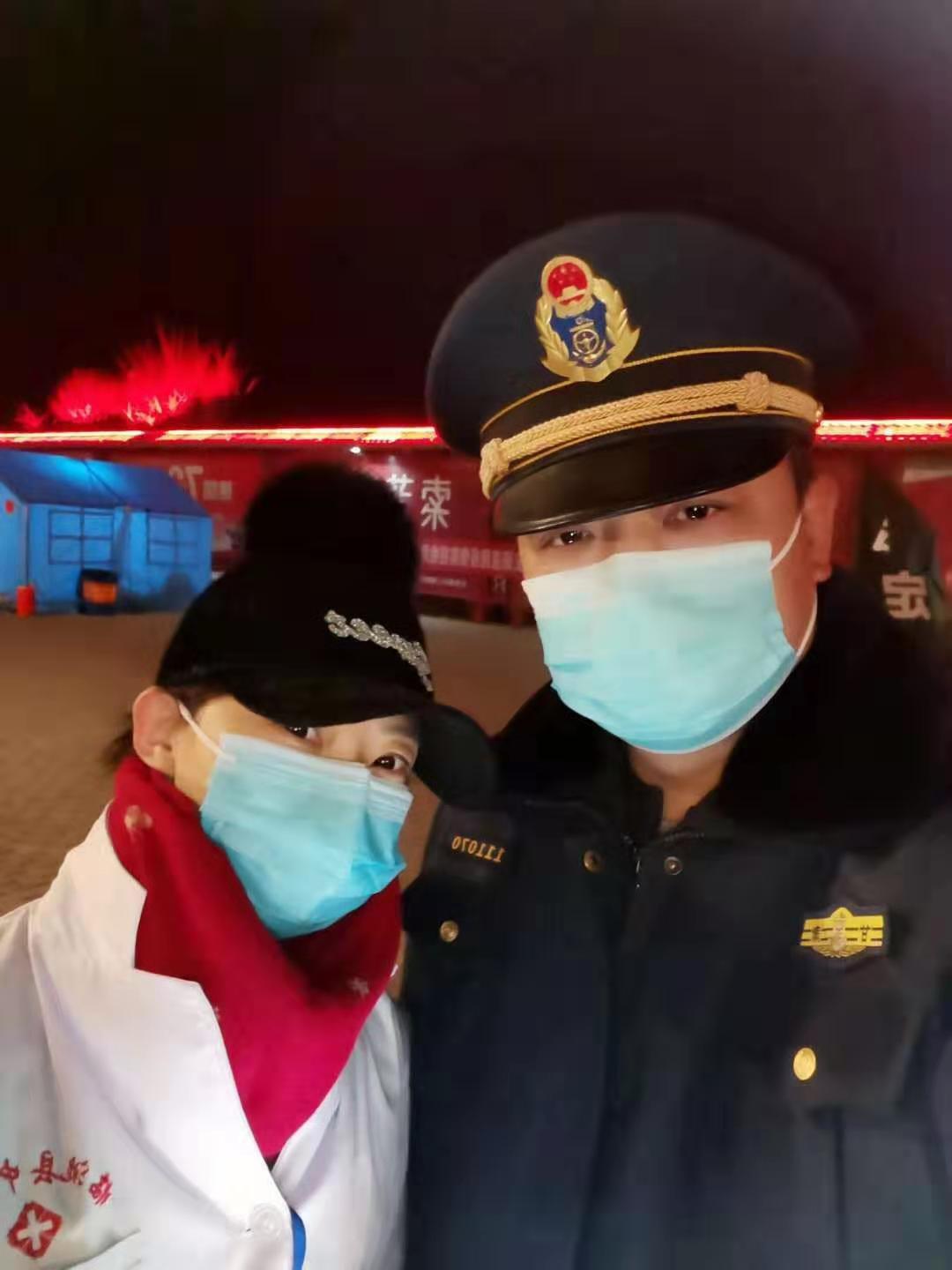 照片中的姑娘,名叫景俊博,是临洮县中医院妇产科一名护士,老公是临洮交通综合行政执法队的工作人员。突如其来的疫情阻击战,打乱了他们原本的春节外出旅游计划,由于岗位的不同,景俊博需要在兰临高速出口冒着零下十多度的严寒,对过往人员进行体温监测,平时还要兼顾医院妇产科的日常工作,非常忙碌。而她的老公,也需要在疫情期间为全县的交通运输工作默默付出。整个春节,他们都放弃了与家人的团聚,舍小家为大家、化小爱为大爱,并肩战“疫”,用最美的青春芳华温暖整个小城。 2月13日晚,在上夜班的老公,偶然遇到了同样正在高速公路出口体温监测点值班的妻子,于是留下了这张珍贵的照片,他们相约,等疫情结束,一起晒太阳、吃火锅、看电影!共赴一场最美的约定!