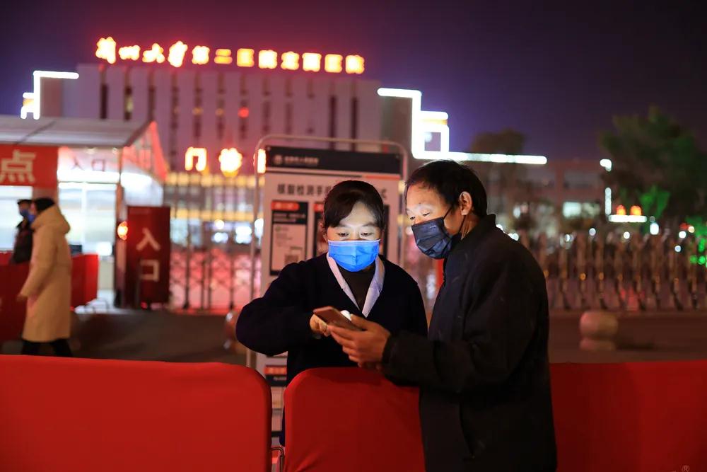 医院核酸采集人数剧增,党员、行政职能部门人员、倒班医护人员组成的志愿者在核酸采集点现场维持秩序,疏导大家保持1米距离、戴好口罩,帮助老人和孩子申领“健康码”、申请核酸检测二维码,为现场人员答疑解惑、疏导有序排队配合采集工作。
