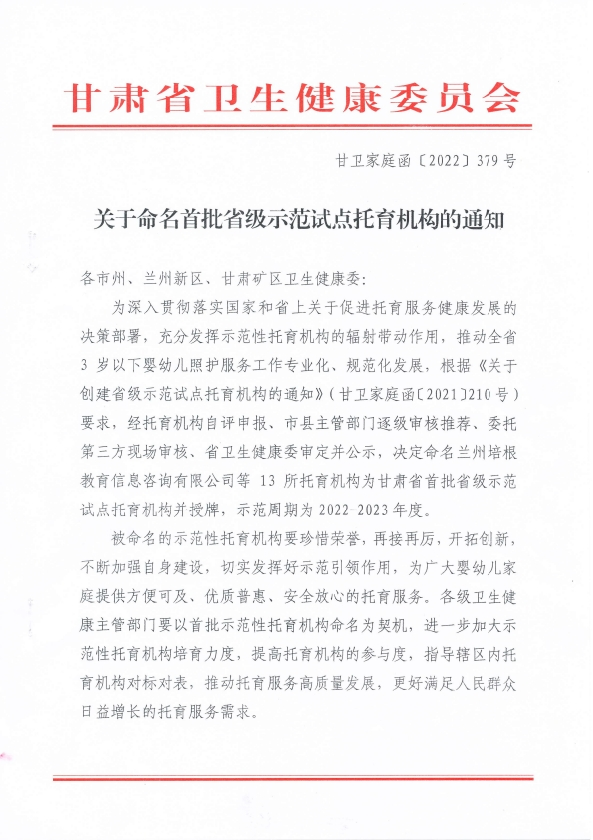 定西市两家托育机构荣获全省首批省级示范试点单位 为深入贯彻落实国家和省上关于促进托育服务健康发展的决策部署,充分发挥示范性托育机构的辐射带动作用,推动全省3岁以下婴幼儿照护服务工作专业化、规范化发展,根据《关于创建省级示范试点托育机构的通知》要求,经托育机构自评申报、市县主管部门审核推荐、委托第三方现场审核、省卫生健康委审定并公示,近期,省卫生健康委员会下发了《关于命名首批省级示范试点托育机构的通知》,决定命名兰州培根教育信息咨询有限公司等13所托育机构为甘肃省首批省级示范试点托育机构并授牌。定西市陇西县品智商务有限公司(品智托育园)、临洮金海育居民服务有限公司(聪明树儿童启智教育)两家机构榜上有名。