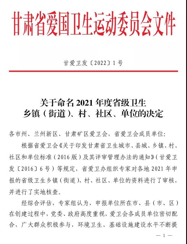 近年来,定西市高度重视卫生城镇创建工作,并将创建工作作为改善居民环境卫生状况,提升居民生活水平的重要举措,根据卫生城镇创建标准,立足实际、因地制宜,将卫生创建工作于美丽乡村建设、整洁村建设有机结合,着力绿化、美化安居环境,积极开展健康教育和健康促进活动,不断完善基础设施建设,提升卫生管理水平,改善环境卫生面貌,加强卫生防病工作,提高群众卫生文明素质,创建工作取得了显著成绩。截至目前,全市共创建省级卫生镇63个、村90个,社区23个、单位91个。如今,我市城镇环境持续优化、功能不断完善、形象明显提升,收到“一创多赢”的良好效应。 2022年,我市将以深入开展爱国卫生运动为契机,以卫生城镇创建为抓手,齐头并进,统筹推进健康城镇、健康细胞建设。加强健康知识科普,倡导文明健康、绿色环保生活方式,切实将爱国卫生工作由环境卫生治理向全面社会健康管理转变,让“大健康”理念深入人心,为全面建成小康社会夯实健康基础,为践行新发展理念创造良好环境。 光荣榜 甘肃省卫生镇(乡)13个 渭源县清源镇、陇西县首阳镇、陇西县马河镇、陇西县宏伟乡、临洮县龙门镇、临洮县康家集乡、岷县申都乡、岷县蒲麻镇、漳县盐井镇、通渭县襄南镇、通渭县新景乡、通渭县鸡川镇、通渭县平襄镇。 甘肃省卫生村31个 渭源县清源镇柯寨村、渭源县清源镇北关村、渭源县清源镇河口村、渭源县清源镇上磨村、渭源县清源镇张家湾村、临洮县康家集汤家川村、临洮县康家集大头山村、临洮县康家集蒲家庄村、临洮县新添镇潘家庄村、临洮县新添镇上街村、临洮县新添镇孙家村、临洮县龙门镇马家湾村、临洮县龙门镇蔡家庄村、临洮县龙门镇五里铺村、临洮县龙门镇龙盟示范村、岷县寺沟镇多纳村、岷县申都乡后家村、岷县茶埠镇岳家湾村、岷县西寨镇田家堡村、漳县金钟镇寨子川村、漳县贵清山镇安门村,漳县石川镇赵家庄村,漳县东泉乡直沟村,漳县马泉乡骆家沟村、通渭县襄南镇大新村、通渭县新景乡姚河村、通渭县鸡川镇丁店村、通渭县常河镇新集村、通渭县平襄镇城关村、通渭县襄南镇祁窑村、通渭县常河镇直湾村。 甘肃省卫生社区2个 渭源县清源镇高宁庄社区,渭源县清源镇君山社区。 甘肃省卫生单位 28个 国网甘肃省电力公司定西供电公司、陇西县福星中心卫生院、陇西县妇幼保健计划生育服务中心、临洮县人民医院、临洮县文庙巷社区卫生服务中心、临洮县洮阳中心卫生院、临洮县教育局、临洮县中学、临洮县二中、临洮县洮阳初级中学、临洮县金泽小学、临洮县实验二校、临洮县实验三校、临洮县椒山小学、临洮县西街小学、岷县茶埠初级中学、岷县西城幼儿园、岷县妇幼保健院、漳县妇幼保健院、通渭县人民医院、通渭县义岗镇中心卫生院、通渭县平襄镇卫生院、通渭县榜罗镇中心卫生院、通渭县碧玉镇卫生院、通渭县应急管理局、通渭县红十字会、通渭县北城镇卫生院、通渭县融媒体中心。