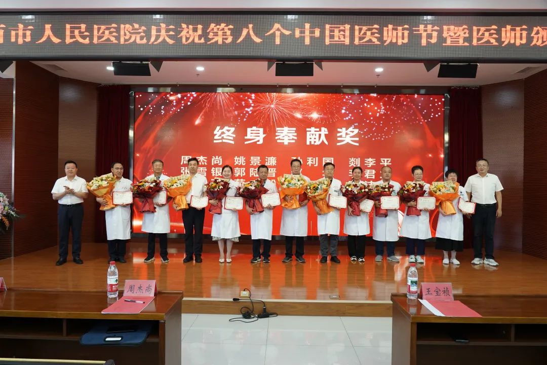 颁奖环节还为11名从医满30年的“终身奉献奖”获得者进行了颁奖留念,感谢他们将全部精力投身临床工作,用满腔热忱服务患者群体,把人生最重要的30年献给了毕生挚爱的医学事业。 王宝祯总结讲话并寄语全体医师,长期以来,我院广大医务工作者牢记救死扶伤的神圣使命,勤勉敬业、无私奉献,锻造出了一支医德高尚、医术精湛、服务优良的医师团队。期望大家常守医者初心,不断在实践中提升自己,锤炼真本领、硬功夫,恪尽职守、廉洁行医,切实当好人民健康的守护者! 传承“厚德精医,博学致远”的院训精神,践行“医者仁心、来者皆亲”的服务理念,这里的每一位医务工作者都在用行动诠释担当:在提升诊疗水平的路上步履不停,在优化服务细节的途中精益求精。定西市人民医院始终以患者之需为导向,以医者之责为坚守。未来,我们将继续带着这份对生命的敬畏与对责任的担当,在守护一方健康的道路上笃定前行,书写属于这片土地的健康答卷!
