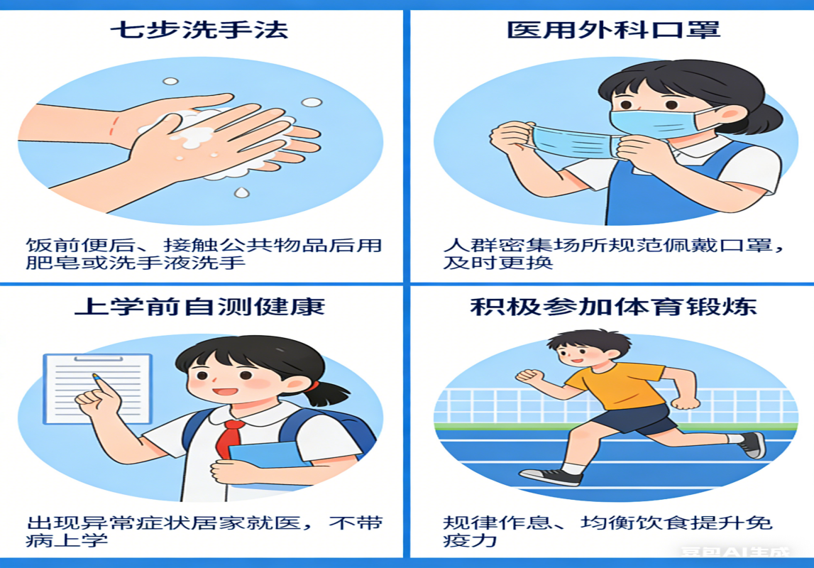 开展健康宣教:通过主题班会、校园广播等形式,普及传染病防控知识,教会学生“七步洗手法”等防护技能,树立自我防护意识。